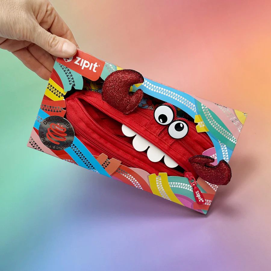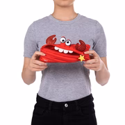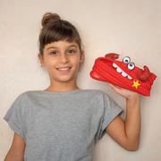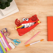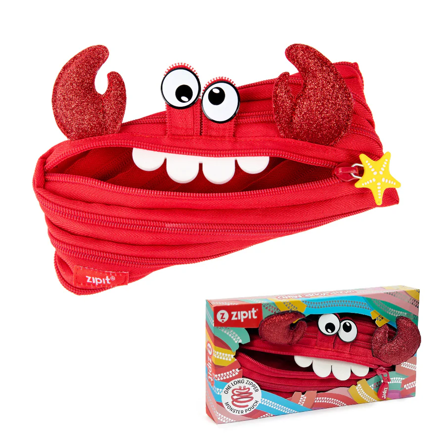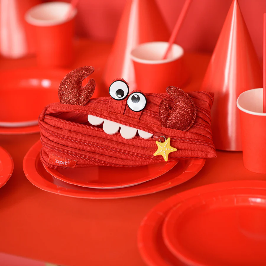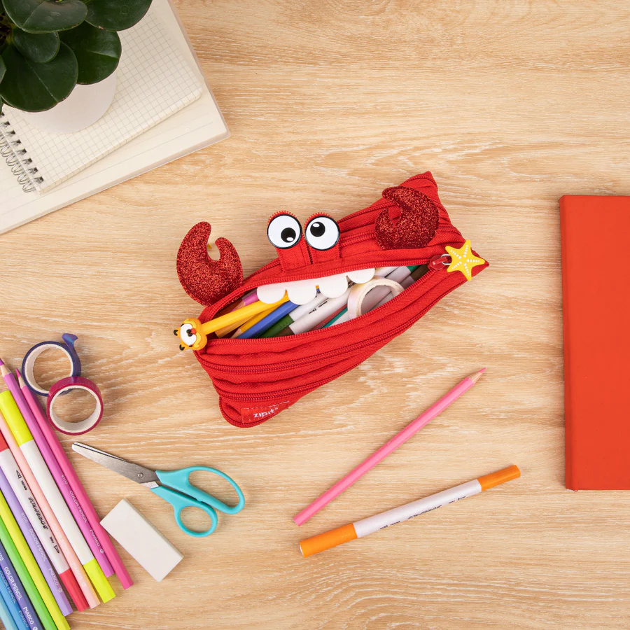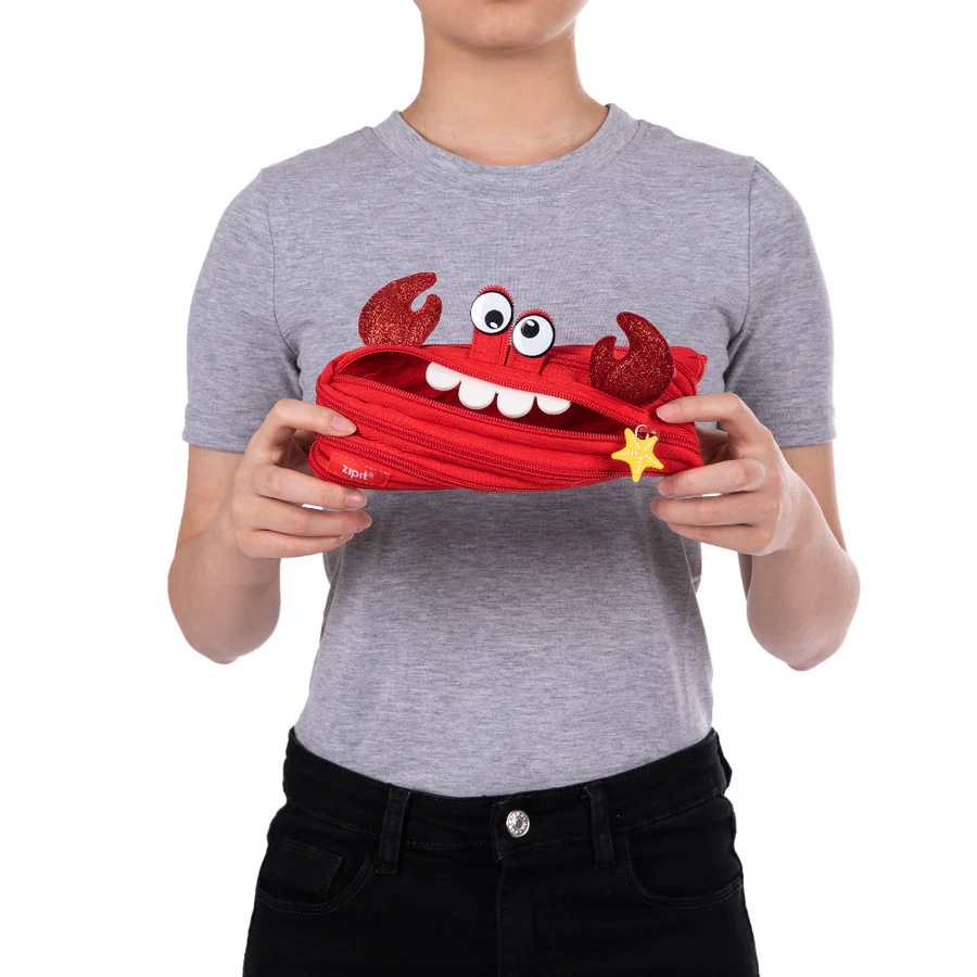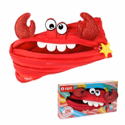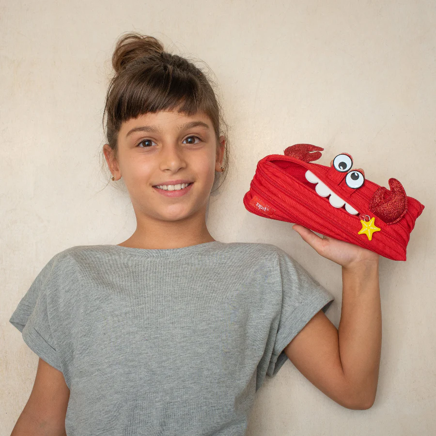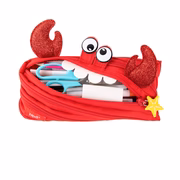 Bring fun and function together with this cute crab pouch for kids. Made entirely from a single continuous zipper, this playful design unzips to reveal a roomy pencil case and zips back up into its unique crab shape.
