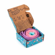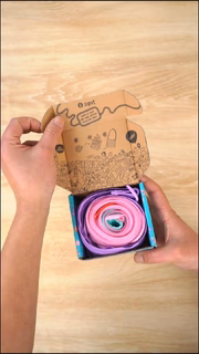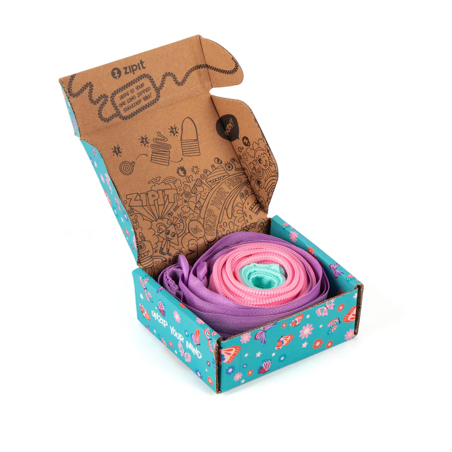 The ZIPIT One Long Zipper Shoulder Bag is made from a single continuous zipper that unrolls into a lightweight, functional bag. It arrives rolled inside a colorful gift box, making the unboxing part of the fun.